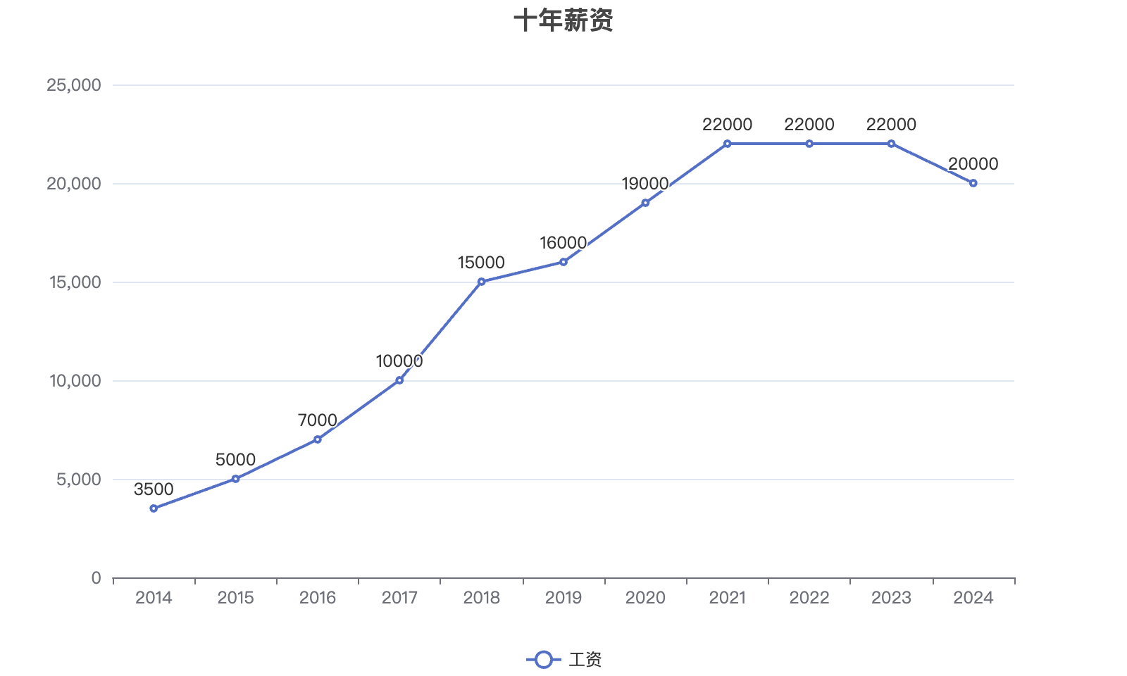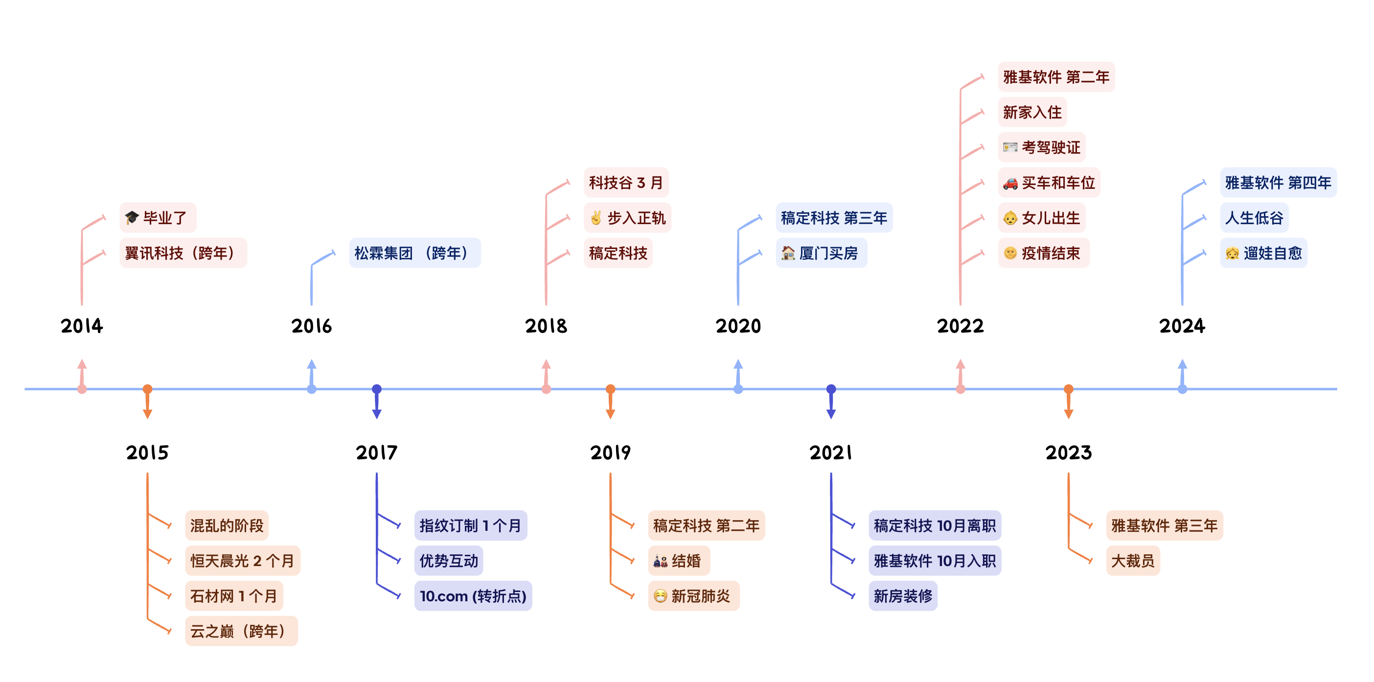 可以看出从 2014 年到 2017 年,我都是处于新手阶段的混乱期,频繁更换工作。幸运的是 2017 年加入的 10.com 让我成长很大,接着顺利进入稿定科技,以及后续来到雅基软件。才能让过去的十年看起来还算圆满。